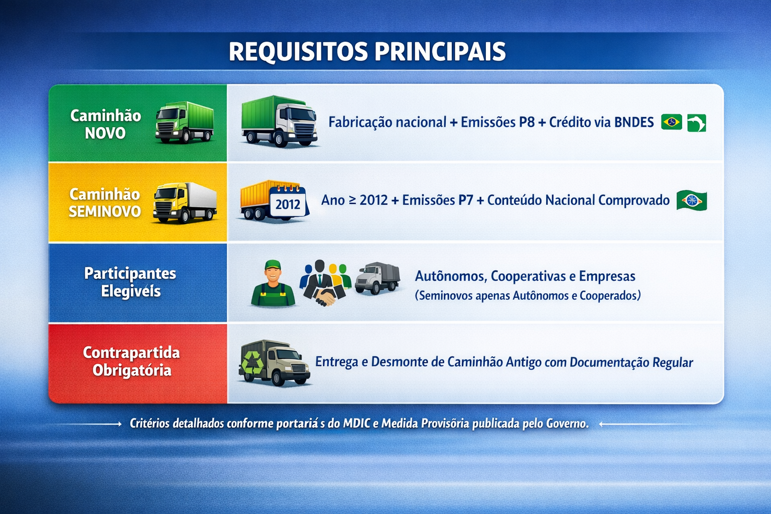 O programa contempla caminhoneiros autônomos, cooperativas e empresas de transporte, com condições especiais de financiamento que tornam mais acessível a aquisição de veículos novos e seminovos.