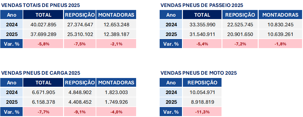 O mercado de pneus de carga foi 7,7% inferior ao ano de 2024, com total de 6,1 milhão de unidades comercializadas. Na reposição, a queda chegou a 9%, com a venda de 4,4 milhões de pneus. Para montadoras foram vendidas 1,7 milhão de unidades, queda de 4%.